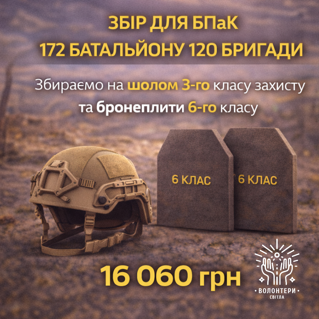 Збираємо для придбання шолому 3го класу захисту і бронеплити 6 класу. Для БПаК 172 батальона 120 бригади