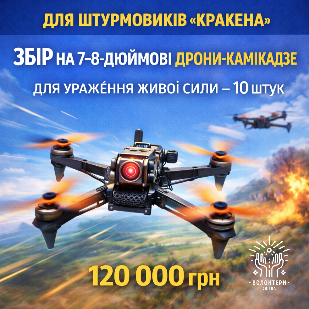 Збираємо для штурмовиків Кракена на 7-8-дюймові дрони-камікадзе для ураження живої сили. Приблизно по 12.000 грн на дрон (це з АКБ). Потрібно 10 штук.