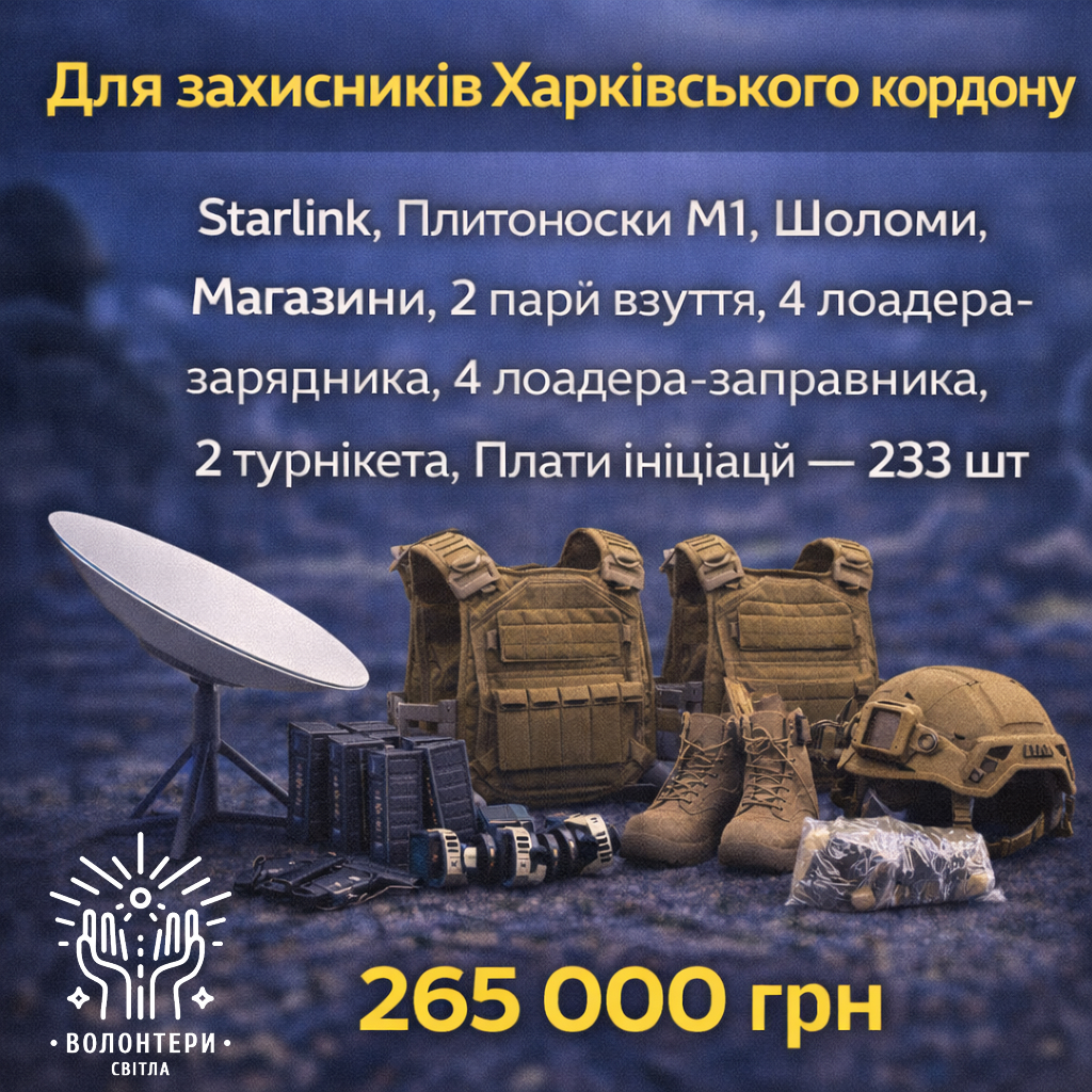 Для захисників Харківського кордону потрібно: Starlink, Плитоноски M1, Шоломи, Магазини, 2 пари взуття, 4 лоадера-заряджувачі, 4 лоадера-зарядника, 2 турнікета, Плати ініціації – 233шт