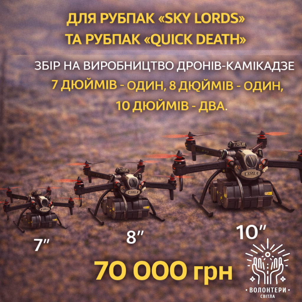 Для РУБПАК «Sky Lords» та РУБПАК «QUICK DEATH» збір на виробництво Дронів-камікадзе 7 дюймів – один, 8 дюймів – один, 10 дюймів – два